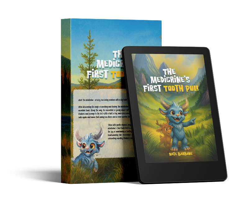 After discovering the magic of brushing and flossing. The Medicrine embarks on a whimsical journey back to his mountain home. Along the way, he encounters a young moose suffering from a mighty toothache, putting his kindness and courage to the test. With a twist and a tug, and a peppermint pat. The Medicrine helps his new friend